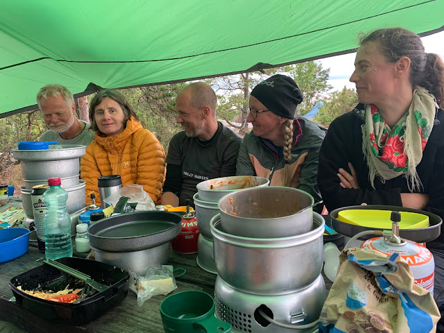 I KFÖ har vi alltid matlag när vi är iväg och oftast är vi 3-4 personer i varje lag. På grund av coronan var det frivilligt denna gång men alla valde att laga mat tillsammans med någon annan. Både trevligare och enklare tycker vi. Och maten - vilka mästervärk. Här är det inte snack om att öppna en burk ravioli som man äter ur kastrullen. Nej, här är det torkad kyckling och olika grönsaker, färsk frukt och spännande exotiska råvaror som alla gärna delar med sig av om någon saknar något i sin matlagning.