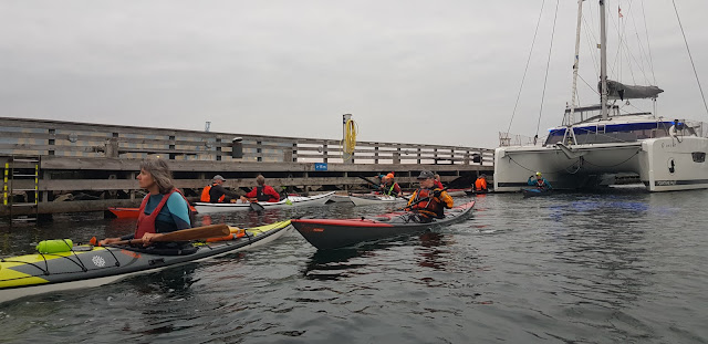 Kl 21.15 paddlade vi genom hamninloppet till Dockan. Där möttes vi av Marie som hade dukat upp med bubbel och jordgubbar. Vi trixade med våra förtöjningslinor och mer eller mindre smidigt tog vi oss upp på den höga bryggan och till Marie.